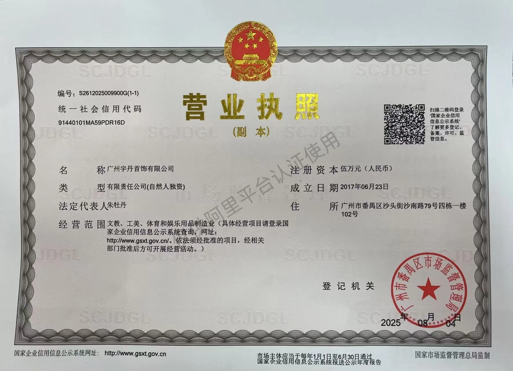 Registered address : No. 102, 1st Floor, Building 4, No. 79 Shanan Road, Shatou Street Guangzhou Guangdong China
